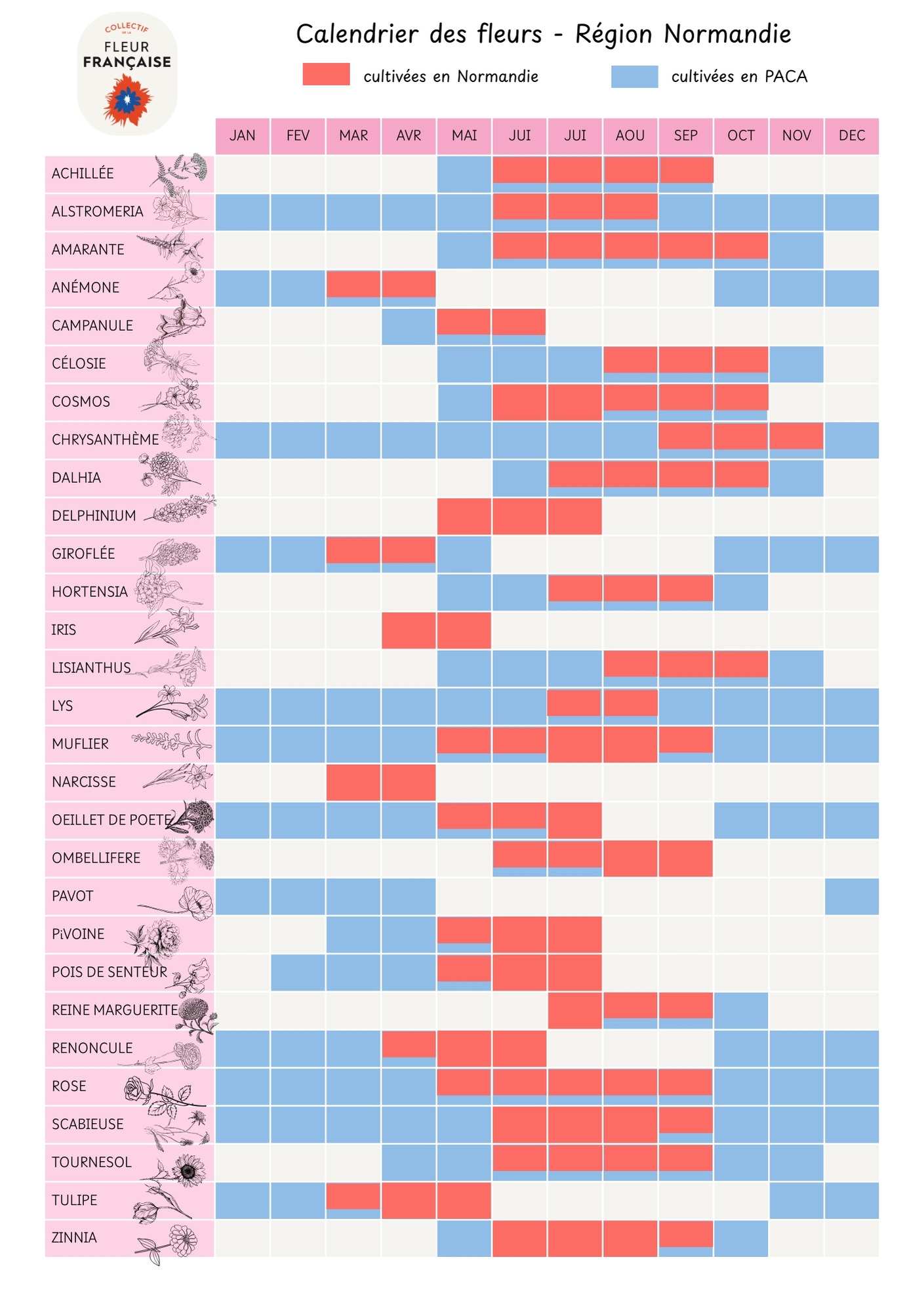 Dans votre région plus d’espèces cultivées à différentes saisons à demander à vos producteurs et/ou grossistes: statice, lilas, glaïeul, arum éthiopie, arum coloré, echinacée, lupin, Allium, bupleurum, calendula, nigelle, rudbeckia.